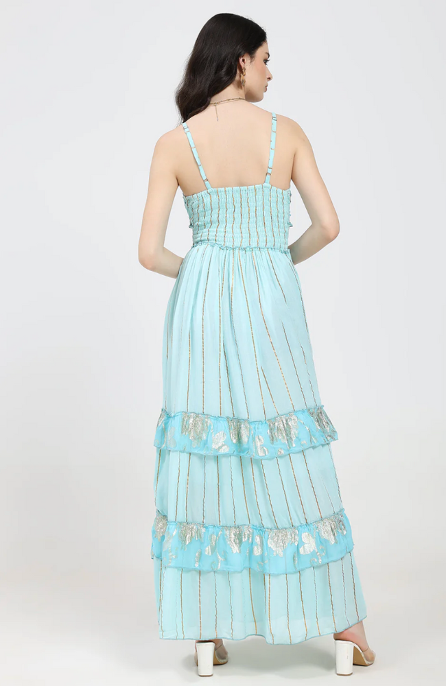 The nalina dress blends dreamy romance with a modern edge. Featuring a plunging V-neckline with delicate straps, a smocked waist with tassel ties, and soft gathers, it flows into a tiered maxi skirt detailed with ruffle accents. The sky-blue base is elevated with metallic gold threadwork and paisley-inspired touches, giving it a light-catching shimmer that feels both relaxed and refined.