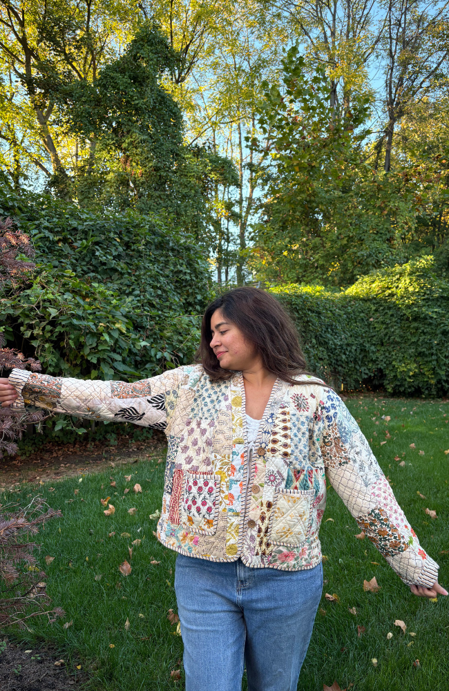 Lightly quilted and fully lined in soft cotton, it’s perfect for layering through shifting seasons — from breezy mornings to golden hour strolls. The relaxed silhouette makes it easy to style over dresses, denims, or cozy knits, while the intricate patchwork detailing ensures no two jackets are ever the same.