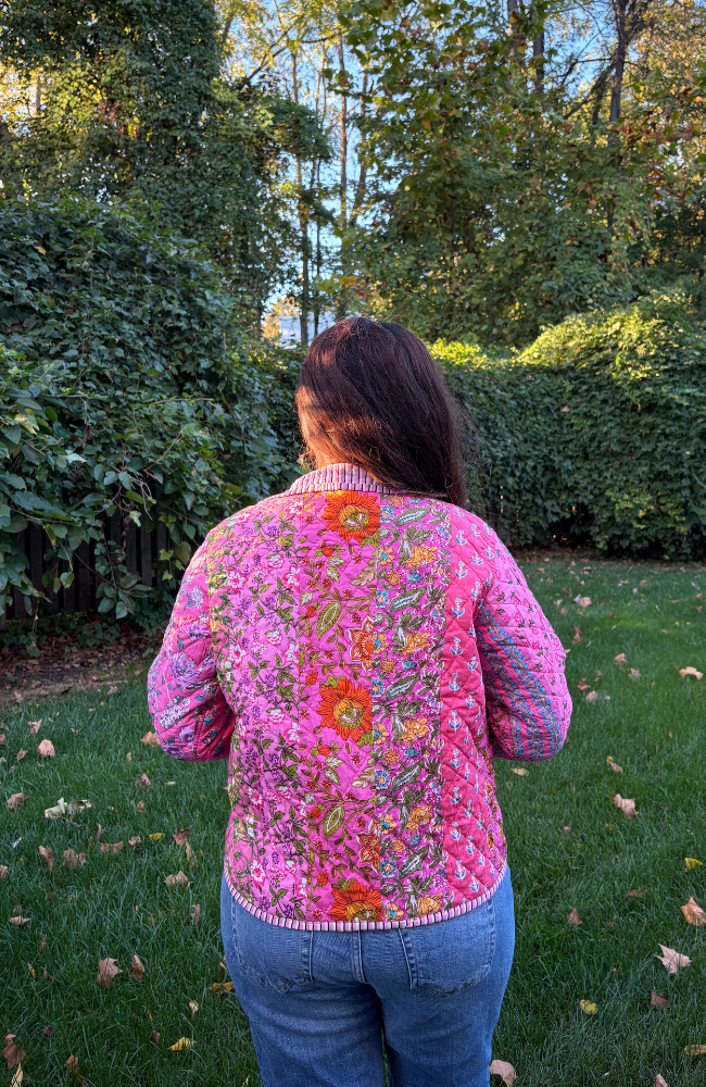 Lightly quilted and fully lined in soft cotton, it’s perfect for layering through shifting seasons — from breezy mornings to golden hour strolls. The relaxed silhouette makes it easy to style over dresses, denims, or cozy knits, while the intricate patchwork detailing ensures no two jackets are ever the same.