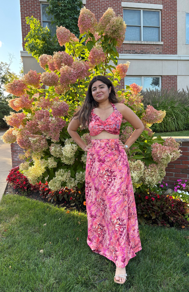 Bold yet ethereal, SERAPHINA brings color to life. The halter top flatters with delicate ties and a twist-front design, painted in hues of hot pink and soft coral. Its matching full-length skirt mirrors the marbled print, opening with a playful slit for freedom and flow. Designed to feel as breezy as it looks, this co-ord carries you through warm days and starlit evenings with effortless charm.